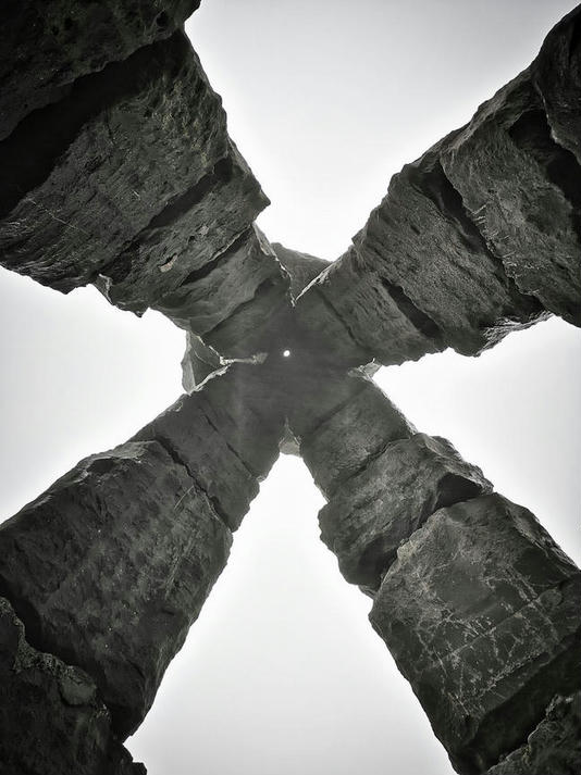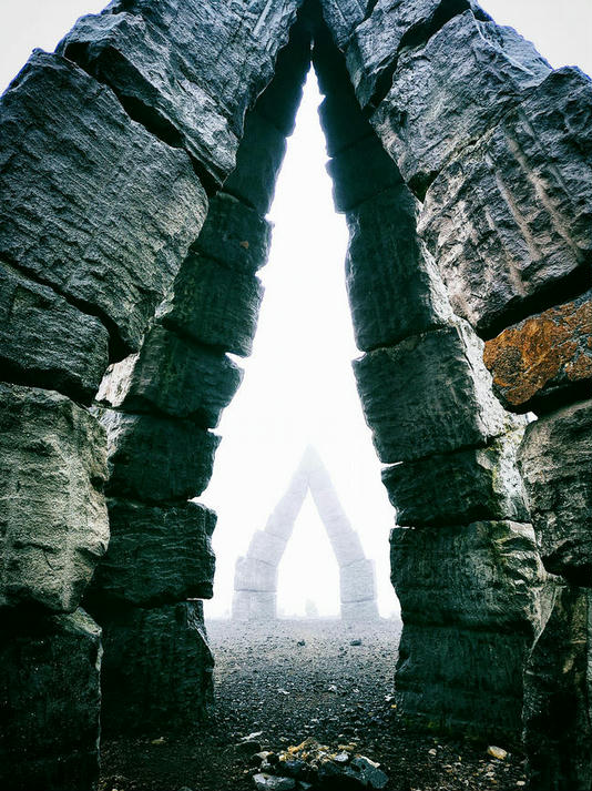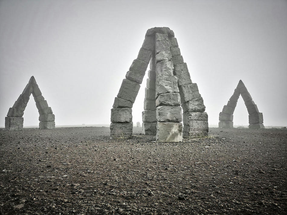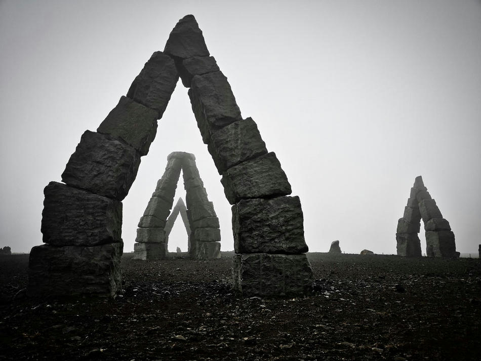 Die Sonnenuhr hat einen Durchmesser von 50 m und besteht aus drei Steinbögen, die an den vier Seiten des Geländes aufgestellt sind. In der Mitte befindet sich eine dritte Steinpyramide, durch die man auch laufen kann. Alle Steinbögen haben eine Höhe von 6 m, wobei die Pyramide in der Mitte sogar 10 m hoch ist. Die Lage vom Arctic Henge ermöglicht – bei klarer Sicht – einen 360 Grad Rundblick über das ganze Gebiet – ausnahmsweise ohne Berge. Hohe Gebäude sind in Island ja sowieso rar. Als wir da waren, war es jedoch so stürmisch und diesig, dass wir nicht einmal 10 m weit schauen konnten. Für uns sind trotzdem spannende Bilder entstanden, die die Atmosphäre ideal eingefangen haben. Die Aussicht bei klarerer Sicht wäre aber auch sicherlich spannend gewesen.