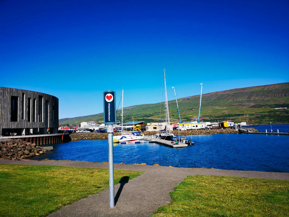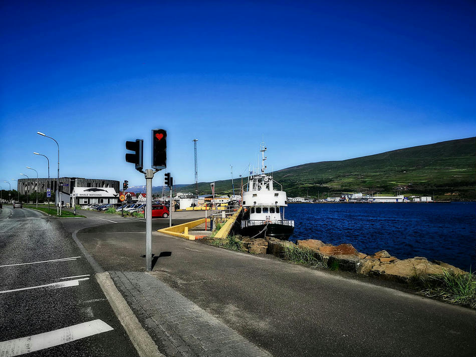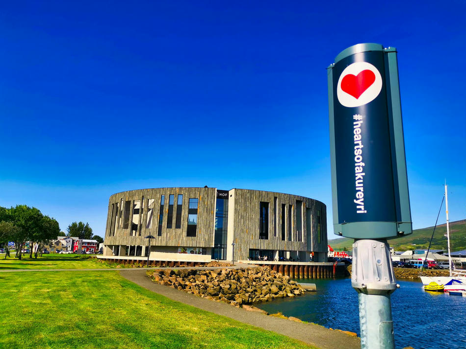 Als wir in die Stadt hinein fuhren, sind wir einfach am Wasser entlang gefahren, um einen Parkplatz zu finden. Irgendwann mussten wir an einer Ampel halten (Ampeln sind wirklich rar in Island) und haben durch Zufall die Herzampeln von Akureyri gefunden! Direkt an den Ampeln gab es einen Parkplatz an der rechten Seite. Hier haben wir unser Auto abgestellt und zunächst erkundet, wo wir überhaupt gelandet sind. Zufälligerweise sind wir direkt im Kultur- und Konferenzzentrum Hof angekommen, in dem sich auch die Touristeninformation von Akureyri befindet. Hier hatten wir noch mehr Glück, denn im Keller befanden sich hier auch Toiletten, die man kostenlos nutzen durfte.