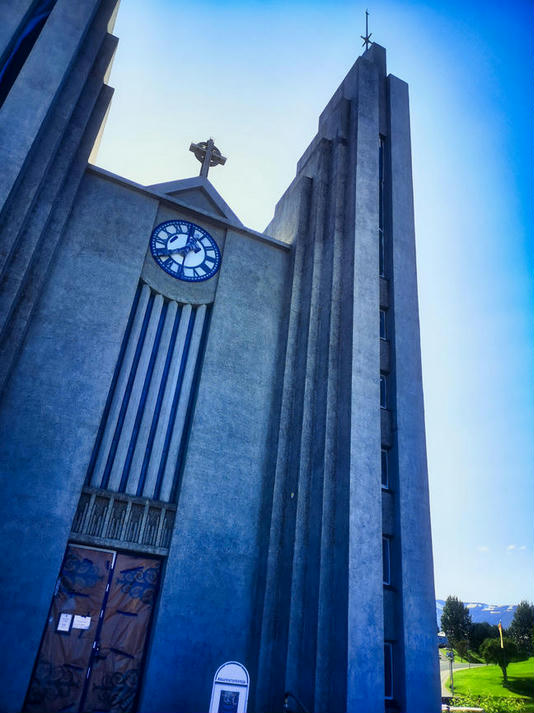 Leider standen die Tische um 14:30 Uhr bereits im Schatten, sodass die Sonne uns nicht weiter warm hielt und wir das Zeit-anhalten auf ein anderes Mal verschieben mussten – wir mussten weiter. Am anderen Ende der Einkaufsstraße befindet sich die Treppe zur Kirche von Akureyri. Die Kirche hier ist wirklich mal ein Alternativentwurf zu den sonst doch recht schlichten kleinen Kirchen Islands. Dadurch, dass das hohe Gebäude nochmals auf einem Hügel steht, wirkte die Gesamthöhe der Kirche noch deutlich höher und wirklich imposant. Leider waren, als wir hier waren, gerade Renovierungsarbeiten, sodass sowohl ein Baukran und Gerüste am Gemäuer standen als auch viele Fenster durch Folien ausgetauscht waren.