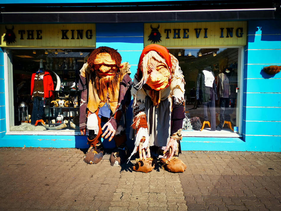 Halb von Neugier, halb von Hunger angetrieben sind wir in Richtung Innenstadt gelaufen, um den beworbenen HotDog Stand anzusteuern. Auf dem HotDog Flyer war eine vereinfachte Stadtkarte verzeichnet, an der wir uns etwas orientieren konnten. Von Hof läuft man zu einem mäßig befahrenen Kreisverkehr, von dem aus man die “Einkaufsstraße” von Akureyri erreicht. Die Straße ist wirklich traumhaft schön. Es handelt sich um eine kurze, gerade Straße, mit vielen schönen bunten Geschäften auf der linken und einem grünen Hügel mit Lokalen auf der rechten Seite. Vor dem Hügel standen zwei Imbisstände – der besagte HotDog Stand und ein Nudelstand – und oben auf dem Hügel war ein kleines Restaurant. In der Ladenzeile war ein The Viking Laden, vor dem zwei übergroße Trollfiguren aufgestellt waren. Unter anderem dieser Laden hat diese Straße für uns einmalig gemacht.