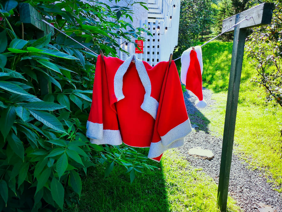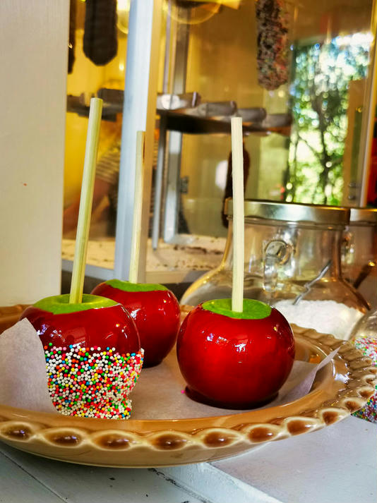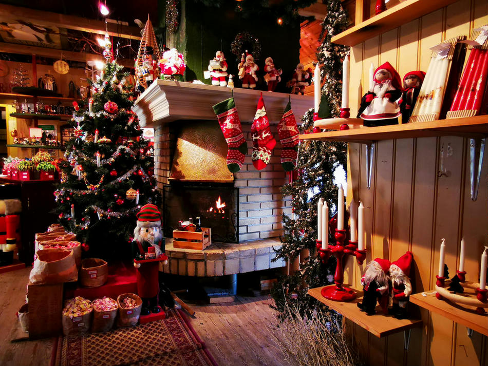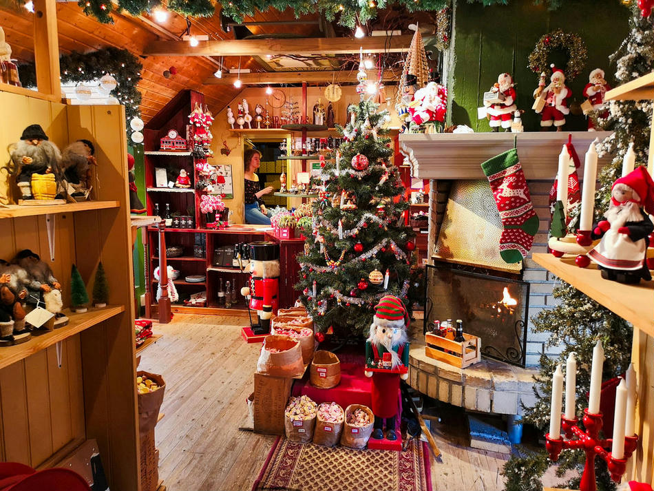 Hier gibt es einen Parkplatz, der, als wir ankamen, auch schon gut gefüllt war; das Weihnachtsthema ist halt einfach auch was für Kinder und auch für einheimische Familien eine Ausflug wert. Vom Parkplatz läuft man einige Meter und sieht schon ein mit übergroßem Konfekt geschmücktes Häuschen. Vor diesem Häuschen gab es unter anderem auch noch einen kleinen Laden, der frische Waffeln, Liebesäpfel und Glühwein verkaufte – ganz, wie man sich Weihnachten eben vorstellt. Im eigentlichen Weihnachtsladen angekommen brannte sogar der Kamin. Das war aber den Verkäuferinnen definitiv auch zu warm, weshalb sie sich konstant Luft zugefächert haben. 😅