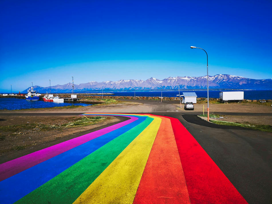 Von hier aus sind wir den Weg am Hafen entlang zum Kjörbúðin Supermarkt gelaufen. Der Weg herunter zum Hafen war wieder mit Regenbogenfarben bemalt. Was es genau mit diesen Farben auf sich hat, die man immer wieder über das ganze Land verteilt findet, haben wir jedoch nicht heraus finden können.