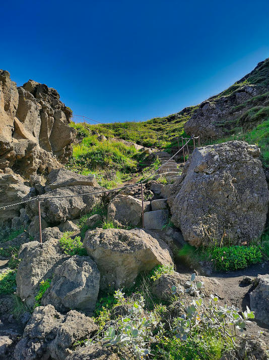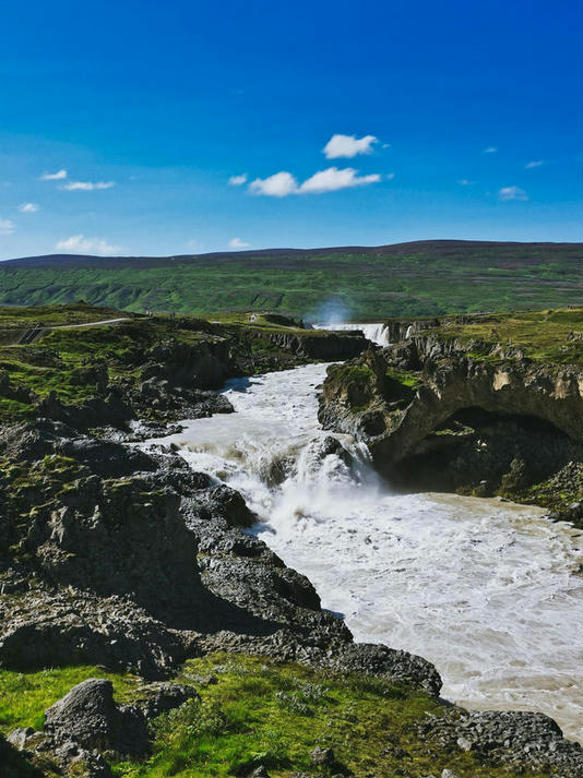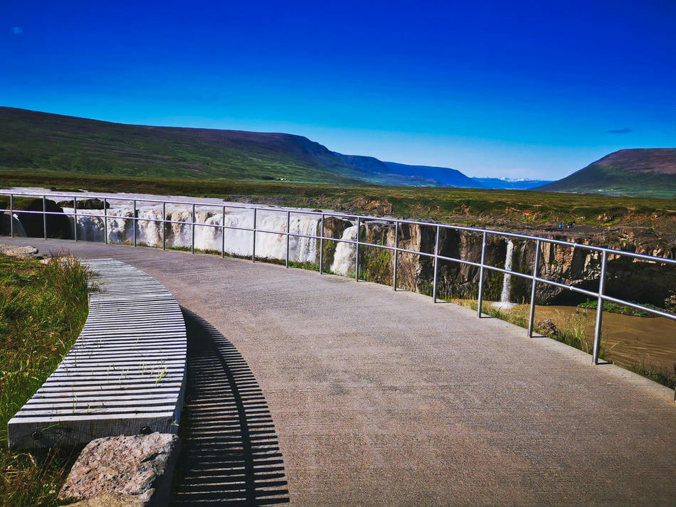 Das ganze Gelände ist ziemlich weitläufig, sodass wir einen guten Kilometer gelaufen sind, bis wir auf der anderen Seite angekommen sind. Das ist aber gar nichts gegen die Gesamtlänge des Flusses: mit einer Länge von 180 km ist der Skjálfandafljót der viertlängste Fluss Islands. Dadurch, dass der Weg am Godafoss echt nett angelegt ist, macht diese Entfernung aber auch überhaupt nichts aus. Es geht jedoch an einigen Stellen immer mal etwas auf und ab, aber immer mit einer schönen Aussicht – man kommt nämlich auch an dem etwas unscheinbareren Geitafoss vorbei. Auf diesen Wasserfall hat man definitiv links des Flusses den besseren Ausblick. Hier führt sogar ein eigener Weg näher am Wasserfall vorbei – und offenbarte uns einen Blick auf einen vom Wasserfall erzeugten Regenbogen. Am Ende des Weges zum Godafoss gibt es noch eine Möglichkeit, eine steile felsige Treppe in Richtung Flussbett zu laufen, um fast unmittelbar an die Stelle zu gelangen, an der der Godafoss 12 m tief in den Skjálfandafljót stürzt. Hier hat man auch einen noch tolleren Blick auf die Felsen, die in die kleine Schlucht des Flusses führen. Alternativ kann man aber auch dem Weg weiter nach oben folgen, um an eine weitere halbrunde Aussichtsplattform zu gelangen. Umrundet mit einem Geländer und ausgestattet mit einer Bank kann man hier das Rauschen des Wasserfalls genießen. Die Plattform ist etwas höher als der Wasserfall gelegen, sodass man sogar etwas über den Wasserfall hinweg sehen kann. Bei blauem Himmel und der Sonne im Nacken hat diese Aussicht auf jeden Fall richtig Laune gemacht!