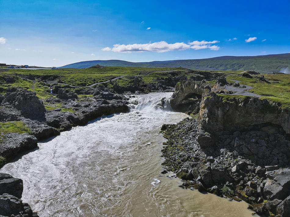 Gegen Mittag haben wir unseren zweiten Stop erreicht: mal wieder einen Wasserfall. Wir hatten überlegt, den Godafoss bereits an Tag 7 zu besuchen – das war der Tag, an dem wir am Myvatn-See angekommen sind. Das hat uns hier noch einmal bewusst gemacht, was für einen Schlenker nach Nordosten wir in den letzten paar Tagen gefahren sind. Aber hey: wir haben in der Zwischenzeit den Polarkreis überschritten!