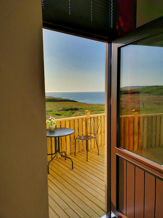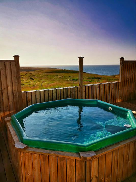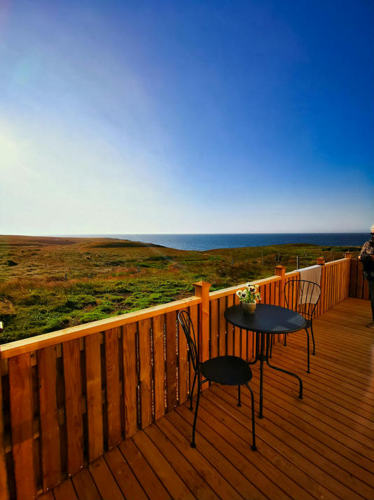 Diese Unterkunft hat eine schöne Holzterrasse, auf der ein Hot Tub mit großartigem Blick direkt aufs Meer stand. Die Terrasse ist durch hohe Holzwände gut vor Wind geschützt, hat aber Fenster in der Holzwand eingelassen, sodass der Blick aufs Meer nicht vollständig verbaut ist. Der Hot Tub wird hier jeden Abend mit frischem Wasser befüllt und kann bis 23 Uhr genutzt werden. Die Küche ist schon etwas älter, aber auch gut ausgestattet. Der Inhaberin war beim Rundgang besonders wichtig zu erwähnen, dass es auch Kunststoff-Becher gibt, die man mit in den Hot Tube nehmen darf.