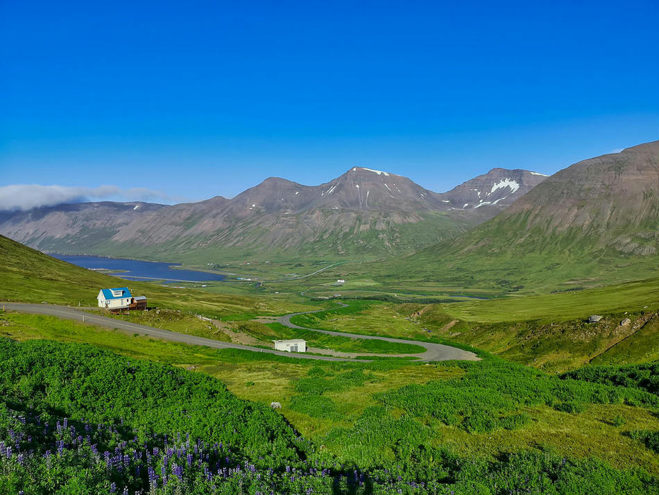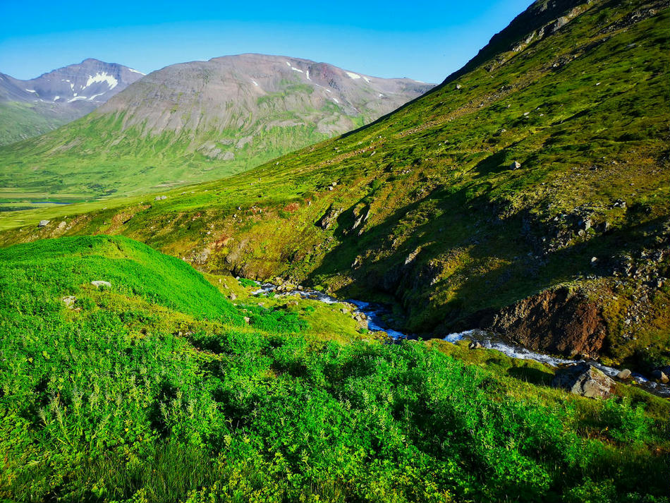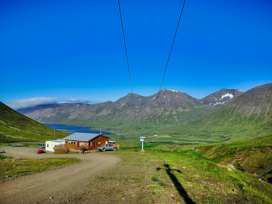 Versuchen, einen Wasserfall zu finden traf es die ersten 10 Minuten tatsächlich. Auf der Suche nach dem Leyningsfoss sind wir die Straße Skarðsvegur hinauf gefahren. Hier plätscherte an der rechten Seite ein Fluss entlang, an dem wir den Wasserfall vermutet hatten. Als wir ein ganzes Stück den Berg hinauf gefahren sind, haben wir irgendwann sogar ein Skigebiet erreicht, das im Sommer jedoch geschlossen war. Der Skilift war nicht in Betrieb, aber vorhanden. Von hier oben hat man aber einen wunderbaren Ausblick bis zum Siglufjörður – den Fjord am Fuße des Berges. Der blaue Himmel zusammen mit den noch teilweise weißen schneebedeckten Gipfeln, dem tiefgrünen Gras und den Serpentinen hoch zum Skigebiet waren toll anzusehen. Irgendwie hatte ich konstant das Bedürfnis noch weiter nach oben zu müssen, weil mit jedem weitern Meter die Aussicht noch besser wurde. Es fühlte sich alles so frei an hier… aber den Wasserfall hatten wir irgendwie nicht gefunden.