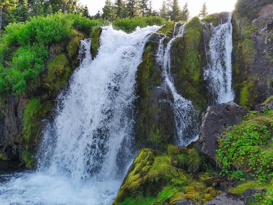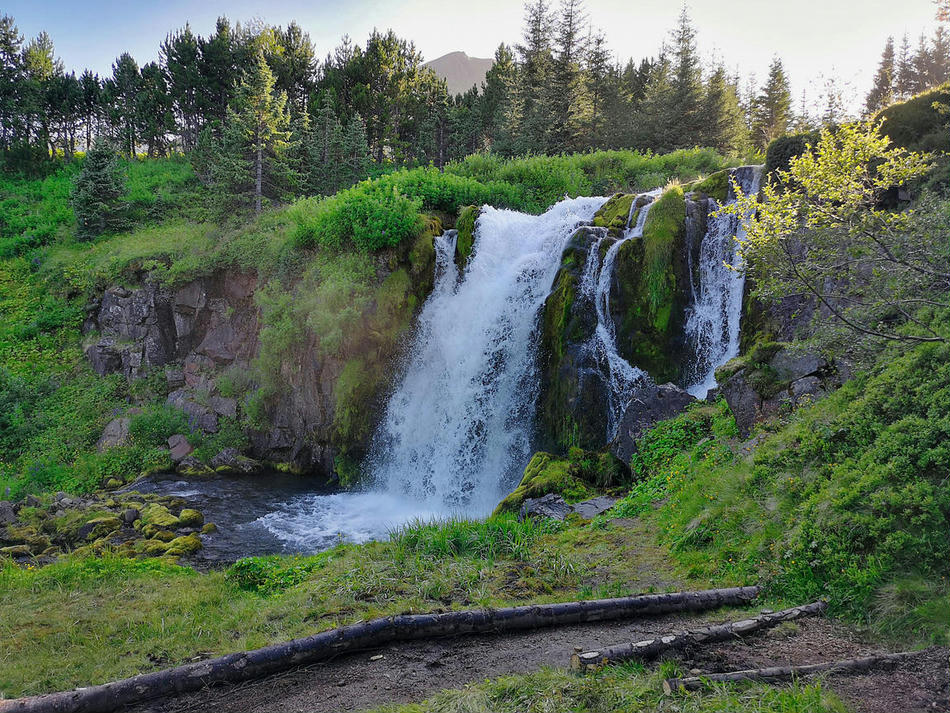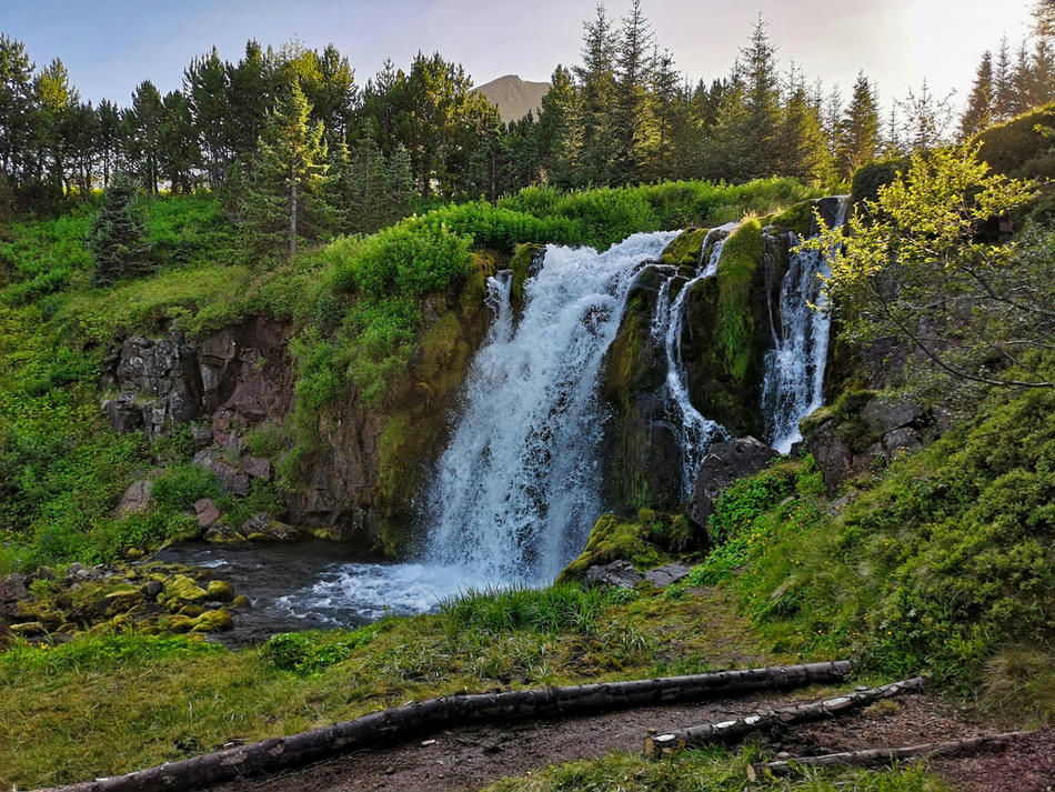 Gemeinsam liefen wir unseren Ohren nach den Weg weiter und nur wenige Meter später haben wir auch tatsächlich den Wasserfall gefunden. Er versteckt sich hier mitten im Wald und ist sehr sehenswert. Diese ruhige Lage und das viele Grün um den Wasserfall herum macht auch diesen Wasserfall einzigartig. Er ist wirklich anders, als die anderen kargen Wasserfälle, die man in Island sonst vorfindet. Nicht nur die Optik macht hier den Unterschied, sondern auch die Luft ist eine andere. Und die trägt nicht wenig zum Gesamtgefühl bei. Wobei ich zugeben muss: mit etwas weniger Insekten in der Luft, wäre dieses “Gesamtgefühl” noch besser gewesen.