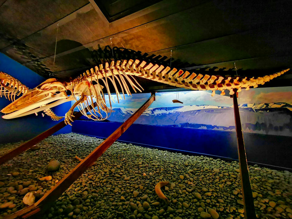 Das Walmuseum in Husavik ist das größte Walmuseum Islands (was praktischerweise unseres Eindrucks nach gar nicht so schwierig ist. Bis auf das Perlan in Reykjavik sind alle Museen doch recht überschaubar). Das Walmuseum in Husavik ist wirklich eines der größeren Museen in Island. Auf zwei Etagen findet man viel Informatives und Beeindruckendes über Wale. Das Museum ist in etwa zweigeteilt: im unteren Bereich gibt es viele Informationstafeln und kleinere Ausstellungsstücke und im oberen Bereich sind viele Skelette ausgestellt. Die dort ausgestellten Skelette stammen alle entweder von gestrandeten und dabei verendeten Walen oder von in Netzen ertrunkenen Walen. Spannend ist auch, wie diese Skelette überhaupt präpariert werden, damit sie hier ausgestellt werden können. Es benötigt offenbar bis zu zwei Jahre, bis die ganzen Knochen frei vom Fleisch und Ölen sind (Walknochen sind offenbar sehr ölig). Danach müssen die Knochen fein säuberlich zusammengepuzzelt werden – und zum Teil mit Pappmaché verbunden werden, das den Halt der in der Zwischenzeit verrotteten Knorpelmasse übernimmt. Wenn so ein Wal dann ausgestellt ist, ist er einfach riesig. Neben den ganzen Walen im Obergeschoss findet sich im Erdgeschoss noch ein weiteres riesiges Walskelett in einem Nebenraum, der genau so lang ist wie der gesamte Haupt-Ausstellungsraum. Diese ganze Länge wird hie benötigt, um ein einziges Walskelett zu präsentieren.