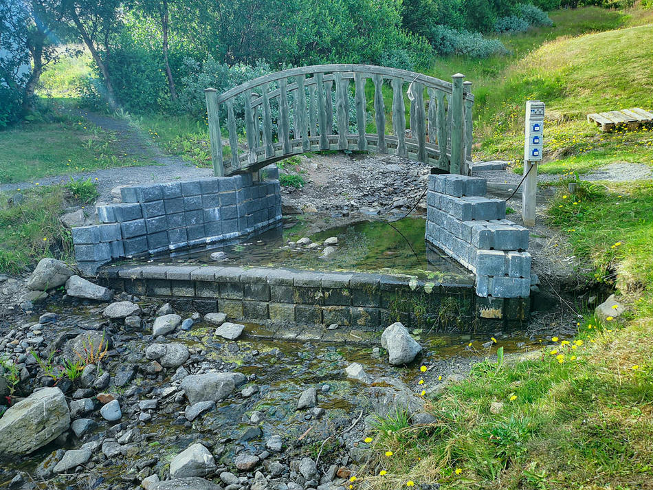 Über den Fluss selbst haben einge Menschon sogar bereits kleine Furten gebaut, über die man leicht den 1 m breiten und 10 cm tiefen Fluss überqueren kann. Der Wasserfall liegt hier sehr ruhig, aber ist halt schlecht zu erreichen und längst nicht so imposant wie andere Punkte in Island.