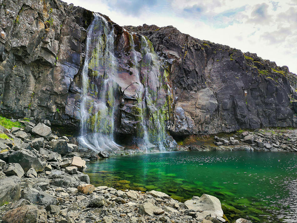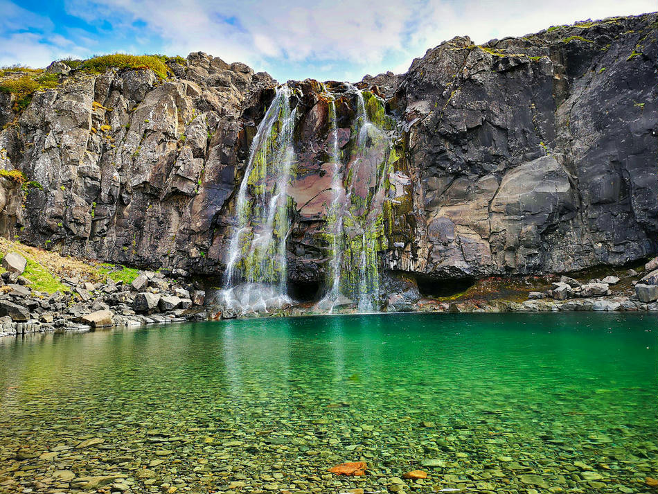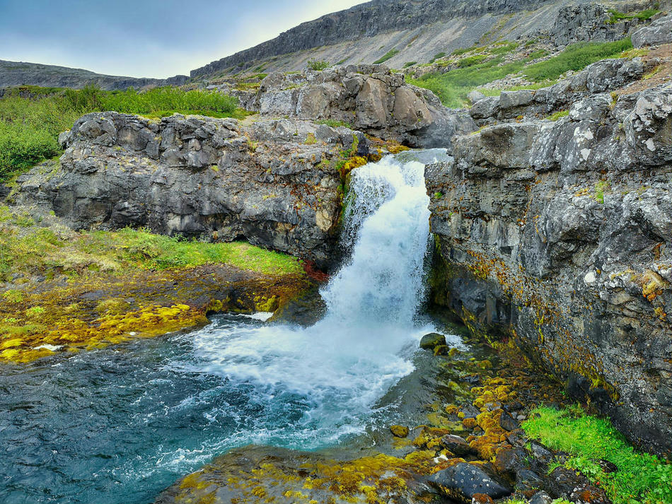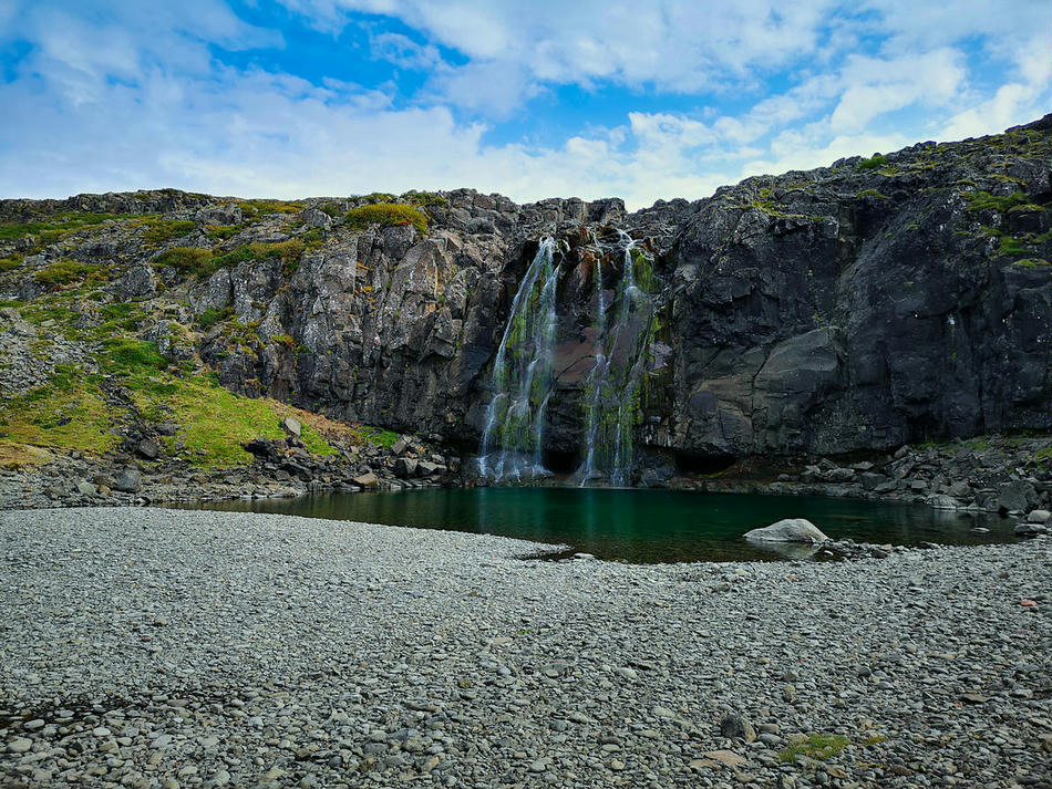 Lediglich ein Kilometer weiter als die Schafsscheune befindet sich ein weiterer wunderschöner Wasserfall, der für Island eher untypisch ist. Einen richtigen Namen hat dieser Wasserfall nicht, die einzige Bezeichnung, die man im Netz findet, lautet einfach Fossar (isländisch für “Wasserfälle”). Der Fossar könnte so auch in Mauritius sein, da er nicht so Wasserreich ist und das Wasser etwas türkis schimmerte.