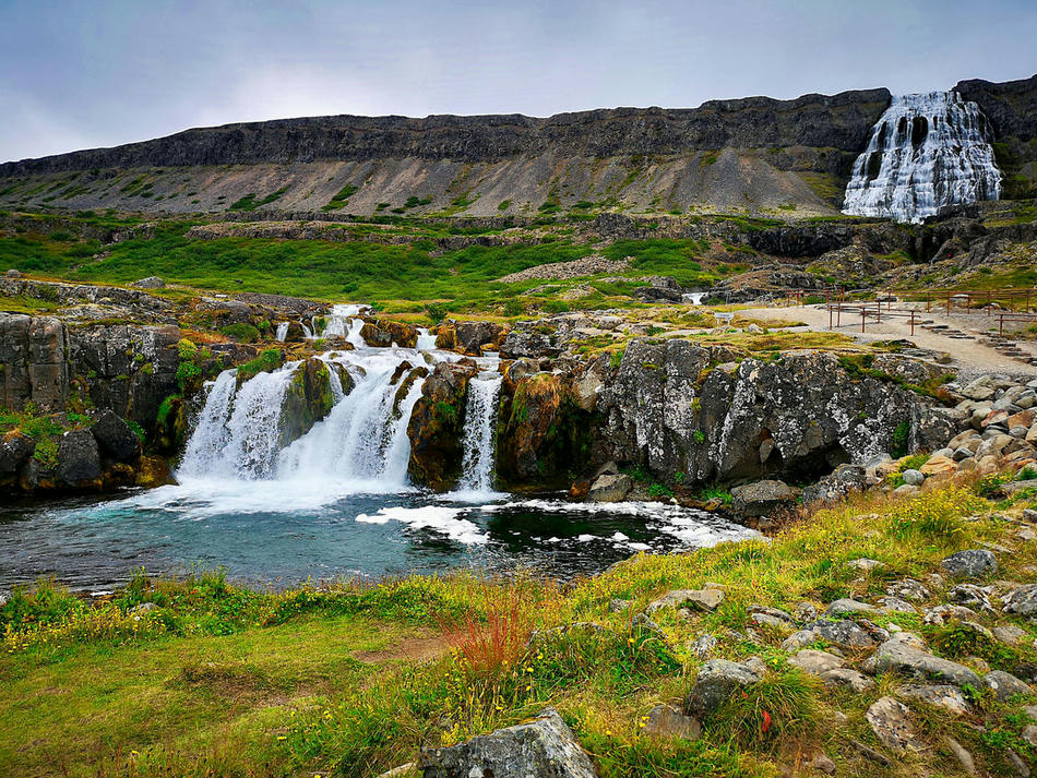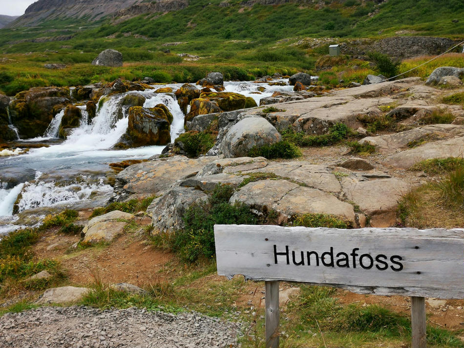 Ausgehend vom Parkplatz verläuft ein Weg 500 m lang hinauf zum Dynjandi. Der Dynjandi ist hierbei allerdings nur einer von vielen Wasserfällen, wenn auch der imposanteste. Der breite Weg führt über Treppen, Klippen und Sandboden an vielen unbekannten, aber dennoch benannten kleineren Wasserfällen vorbei. An dem Fluss, in dem der Dynjandi liegt, liegt hier am Weg nämlich nicht nur der Dynjandi selbst, sondern auch der Göngumannafoss, der Hundafoss, der Strompgljúfrafoss und einige weitere Wasserfälle. Jeder dieser kleineren vorgelagerten Wasserfälle ist für sich genommen schon sehr nett – aber der Dynjandi toppt hier natürlich alle.