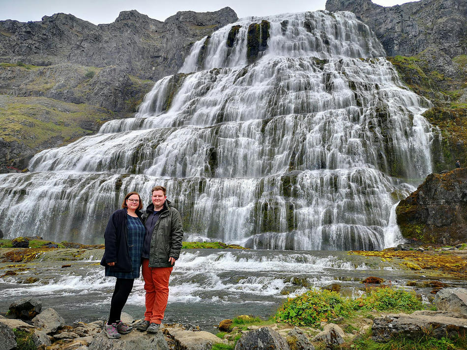 Oben am Dynjandi angekommen, gibt es sogar noch eine letzte Treppe, die es erlaubt noch einige Meter weiter nach oben, neben den Dynjandi zu laufen. Von hier aus hat man bestimmt ein noch bessere Aussicht auf den Flusslauf nach unten – uns hat aber der Anstieg bis hier hin schon gereicht. Wenn wir ganz ehrlich sind, hatten wir uns den Weg etwas entspannter vorgestellt – gerade vor dem Hintergrund, dass hier ja auch Reisegruppen angefahren werden.