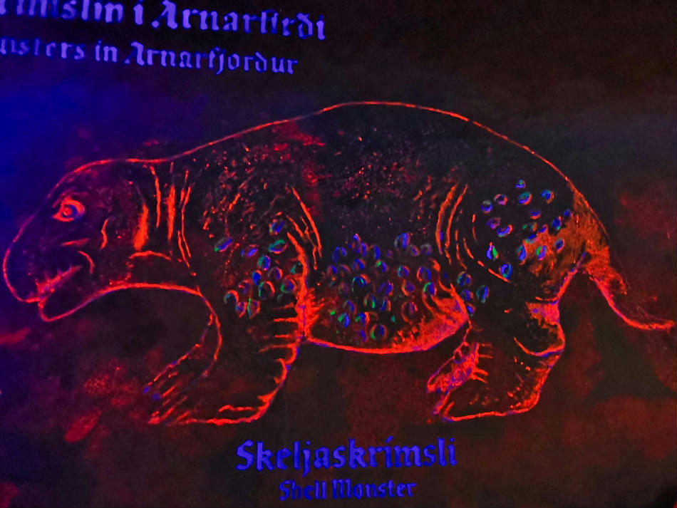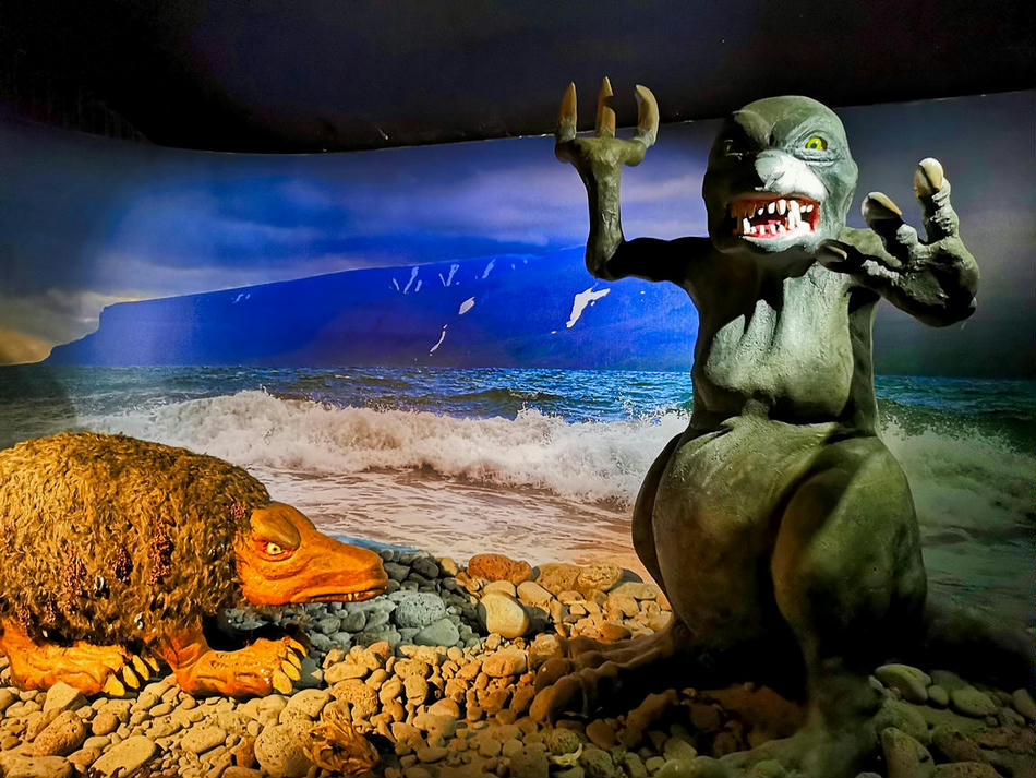 Die Ausstellung selbst war gar nicht so überwältigend – aber nachdem wir die irgendwie lieblose Polarfuchs Ausstellung gesehen hatten machte hier alles richtig etwas her. In den gesamten Ausstellungsräumen (es gab insgesamt 3, wobei einer sehr groß war) haben die Eigentümer eine richtig schön schaurige Stimmung kreiert – sowohl was die Lichter als auch die ausgestellten Figuren und die Musikuntermalung angeht. An eine Wand waren verschiedene Monster mit leuchtender Farbe aufgemalt und an einer anderen Stelle stand ein künstliches dinoartiges Monster herum. Die verschiedenen Infotafeln erläuterten, wo Isländer überall Monster vermuten, insbesondere wird hier in den Westfjorden aber von Monstern in den Fjorden gesprochen.