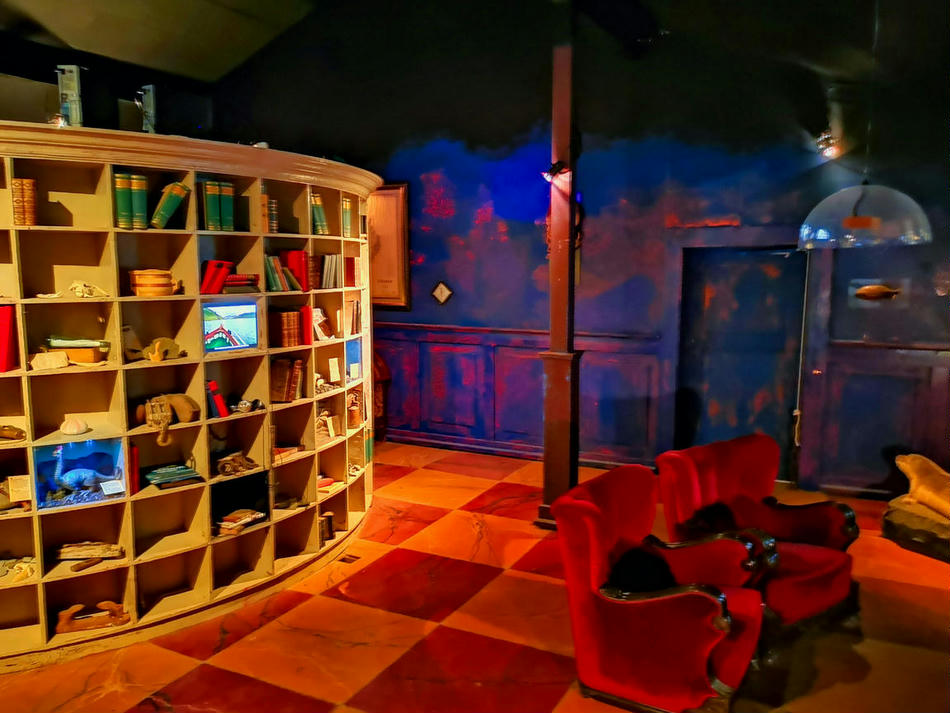 Im größten Raum, der wie eine sehr alte Bibliothek aufgemacht war, gab es im Regel kleine Monitore mit angeschlossenen Kopfhörern, in denen in Dauerschleife Augenzeugenberichte von Menschen zu sehen waren, die bereits ein Monster gesehen hatten. Der ganze Charme dieser Bibliothek wurde dadurch verstärkt, dass keins der Bücher, das hier herumstand eine Attrappe war – sogar einen deutschen Brockhaus in einer Auflage aus 1931 konnten wir hier finden. Aber neben den Büchern, wie dem Brockhaus, die nur zum Flair beigetragen haben, lagen hier auch Bücher aus, die tatsächlich zur Thematik passten: Ein Buch mit “ungewöhnlichen” Tieren (die man für Monster halten könnte) zum Beispiel.