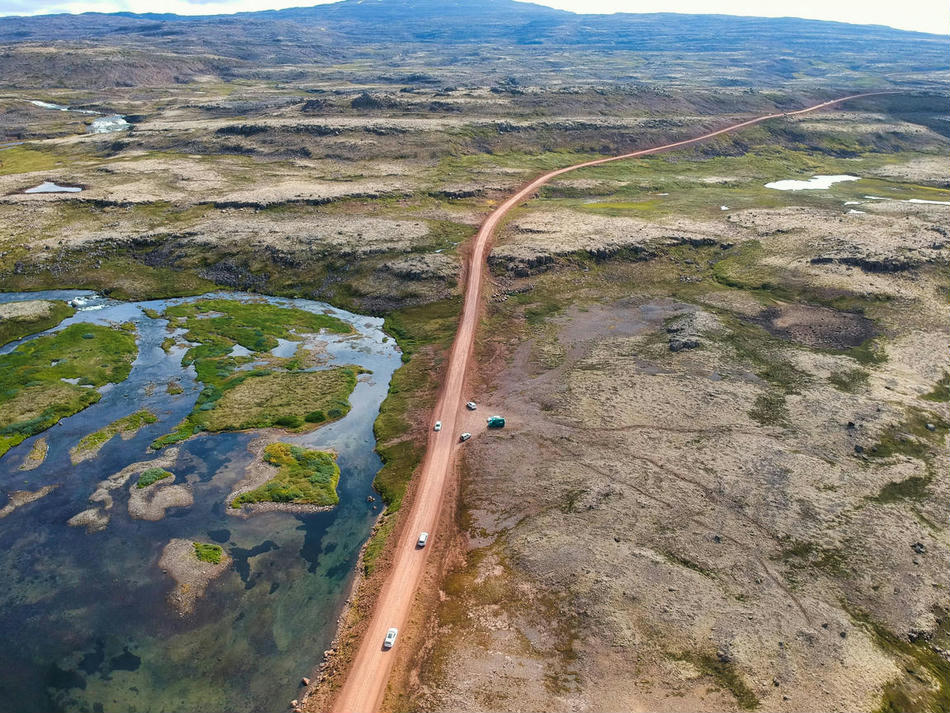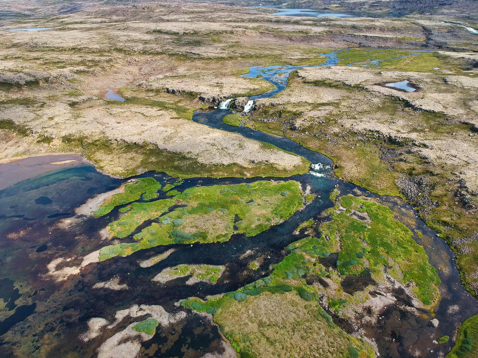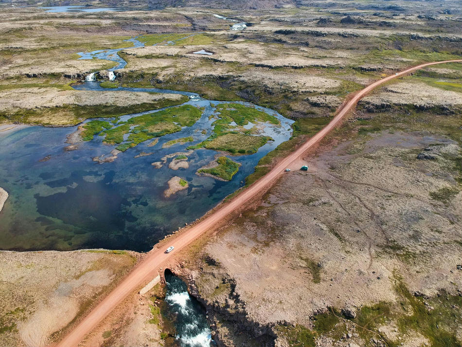 Vom Dynjandi sind wir die Straße 60 weiter in Richtung Süden gefahren. Unser nächstes Ziel war nämlich eine kleine niedliche Schafsscheune, die direkt an der Straße liegt. Bevor wir jedoch auch nur zehn Kilometer gefahren sind, sind wir schon wieder auf einem kleinen Parkplatz abseits der Straße stehen geblieben. Rechts der Straße war der Boden trocken und rot, links gab es einen schönen Fluss mit einem kleinen Wasserfall, um den herum alles grün war. Richtig schön hier und die Drohnenbilder haben sich richtig gelohnt! 😛