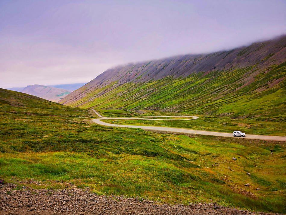 Oben auf einem Bergpass hat man eine wirklich grandiose Aussicht auf die Serpentinen, die man hinauf gekommen ist. Gleichzeitig ist es von der höchsten Stelle gar nicht mehr so weit bis zum nächsten Fjord, an dem sich auch der Dynjandi befindet. Dadurch, dass der Dynjandi allerdings auf der anderen Seite des Fjordes ist, sieht man ihn schon sehr lang, bevor man ihn tatsächlich erreicht. Man sieht den Wasserfall bestimmt zehn Kilometer, bevor man ihn erreicht.