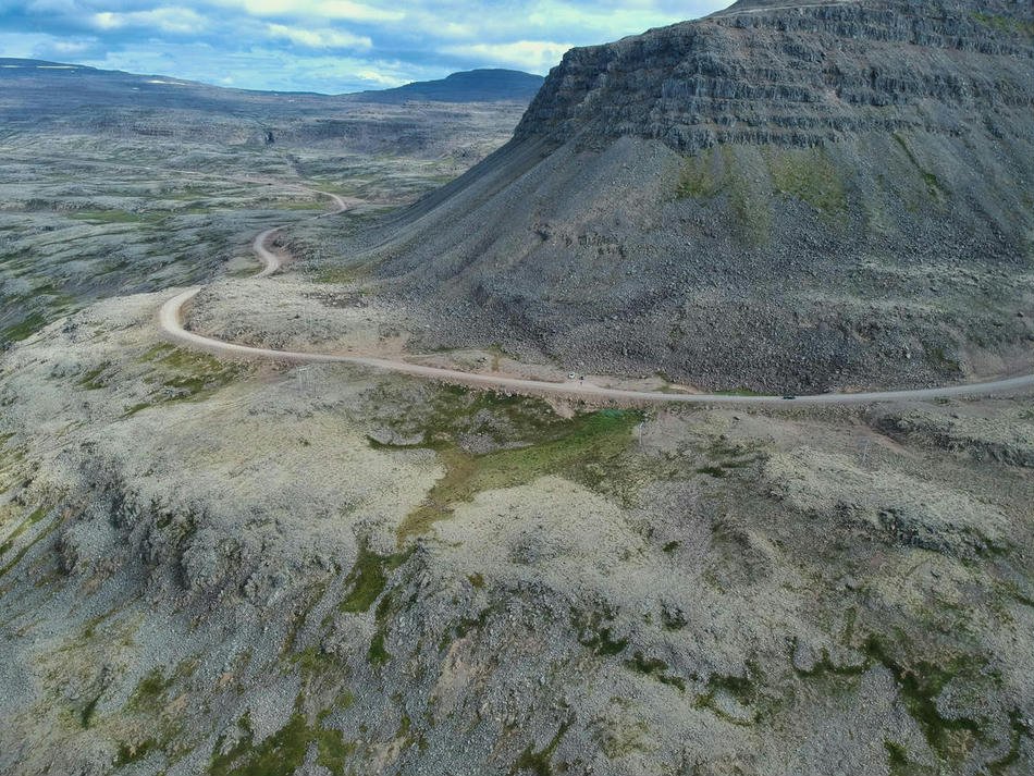 Von dem (für uns unsichtbaren?) Önundarfjörður aus sind wir weiter über die Schotterstraße 60 nach Südwesten gefahren. Die Straße ist auch mit PKWs zu meistern, aber hat zum Teil echt beachtliche Steigungen. Wir fanden die Straße aber auch so faszinierend, dass wir uns nicht ganz an unser vorheriges Credo “früh ankommen” gehalten haben. An ein, zwei Stellen mussten wir einfach nochmal anhalten, um ein paar Fotos zu machen um die Situation einzufangen.