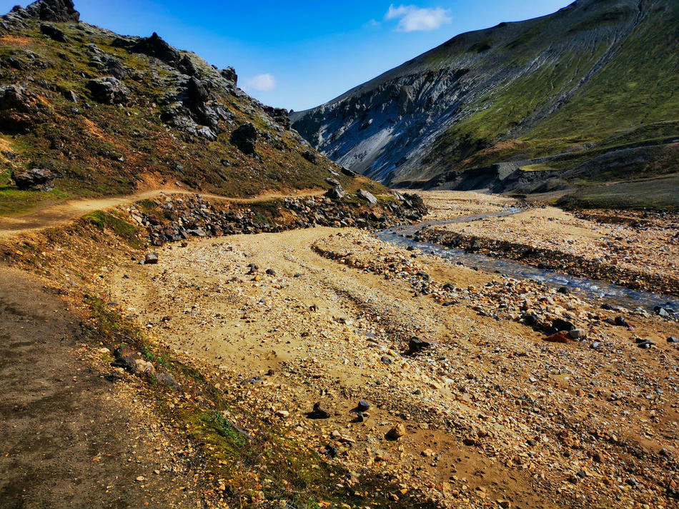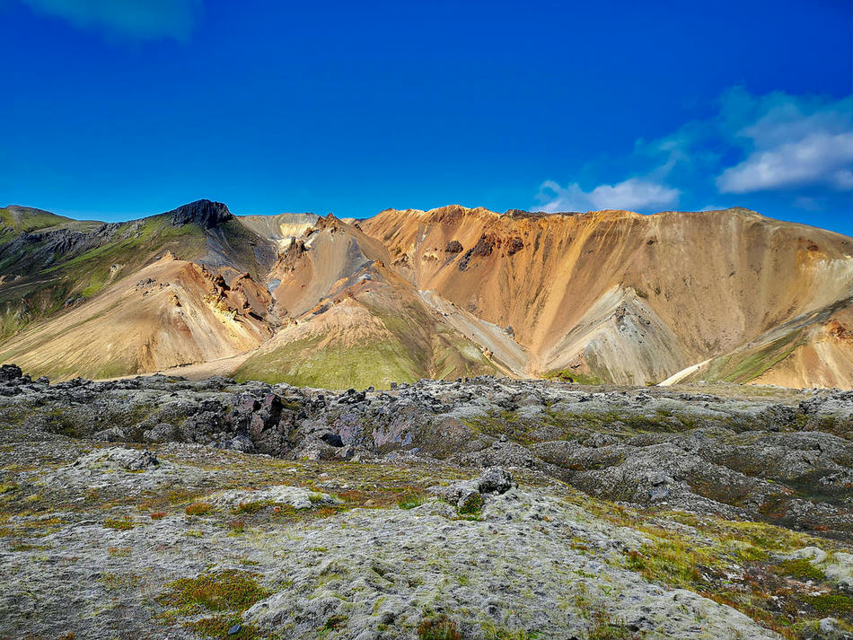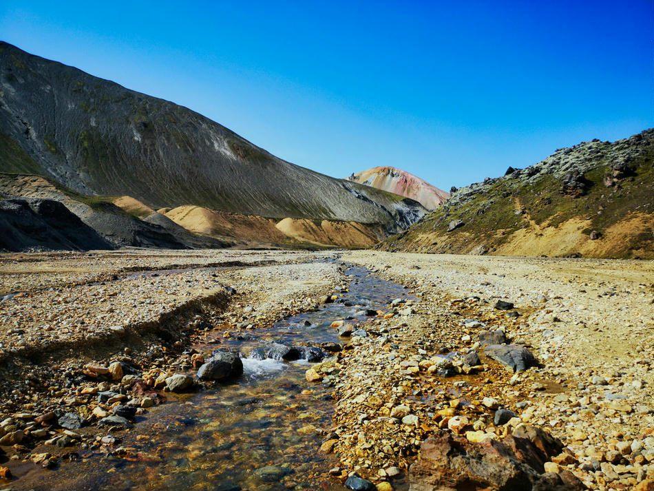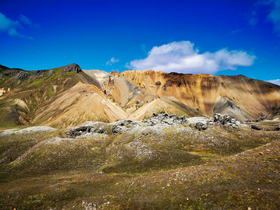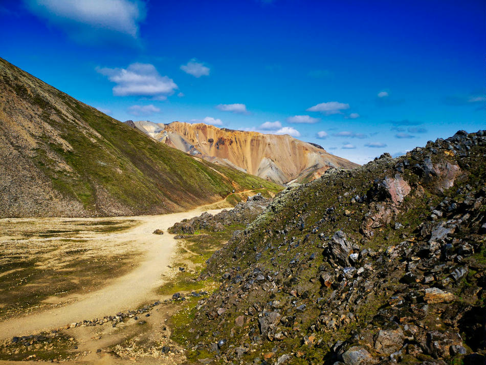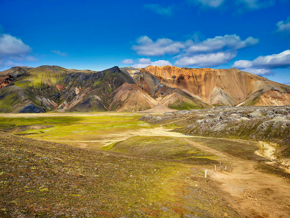 Aber wie auch beim ersten Wechsel von Fluss auf Lavafeld änderte sich hier der Schwierigkeitsgrad des Weges enorm: Wir mussten nicht mehr klettern, sondern konnten relativ entspannt dem breiten Laugarvegur (so heißt der Weg offenbar) folgen. Der Weg verlief fast konstant bergab (wir waren ja auch lange sehr anstrengend über das Lavagebiet hier hochgeklettert) und hinter jeder Kurve hatte man eine andere faszinierende Aussicht auf umliegende Bergketten. Die Sicht auf diese Bergketten ist wirklich grandios und für uns das eigentliche Highlight einer jeden Wanderung in Landmannalaugar. Die Bergketten sind richtig bunt. Die Hänge der Berge sind in so vielen verschiedenen Farben, die alle natürlichen Ursprungs sind. Mineralien aus vulkanischem Ursprung (Schwefel, Pechstein, Kalk, Eisen) und Moos machen die Berge zu einem richtig tollen Farbenspiel.