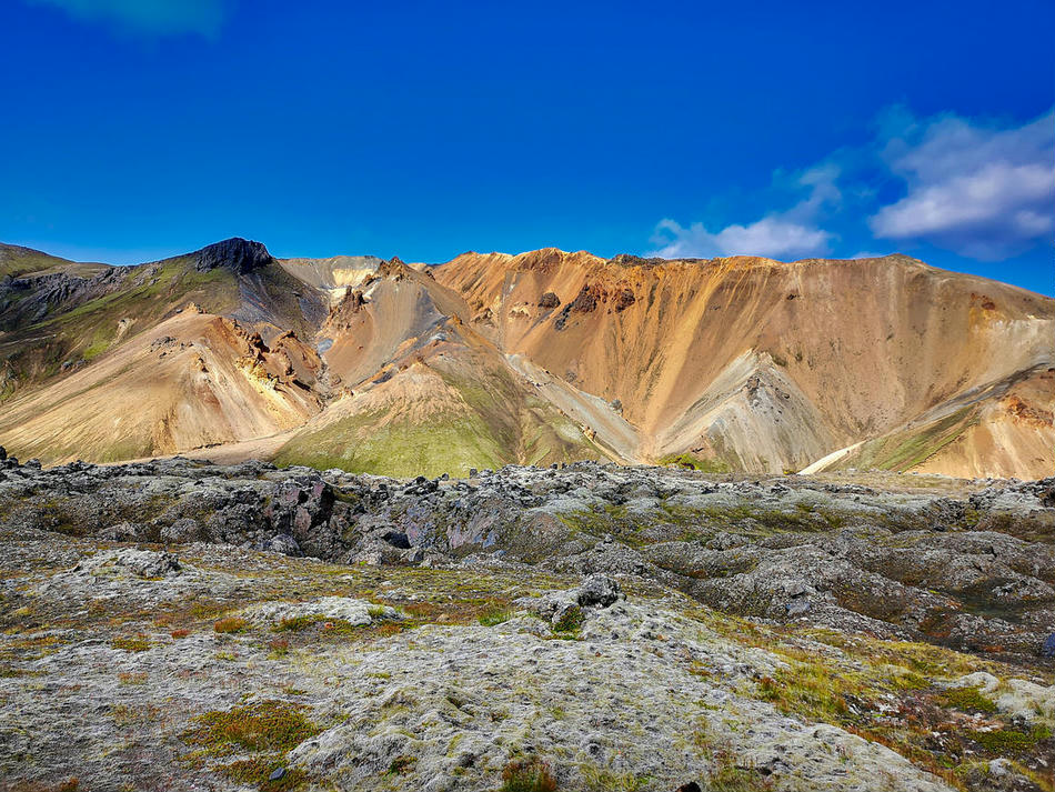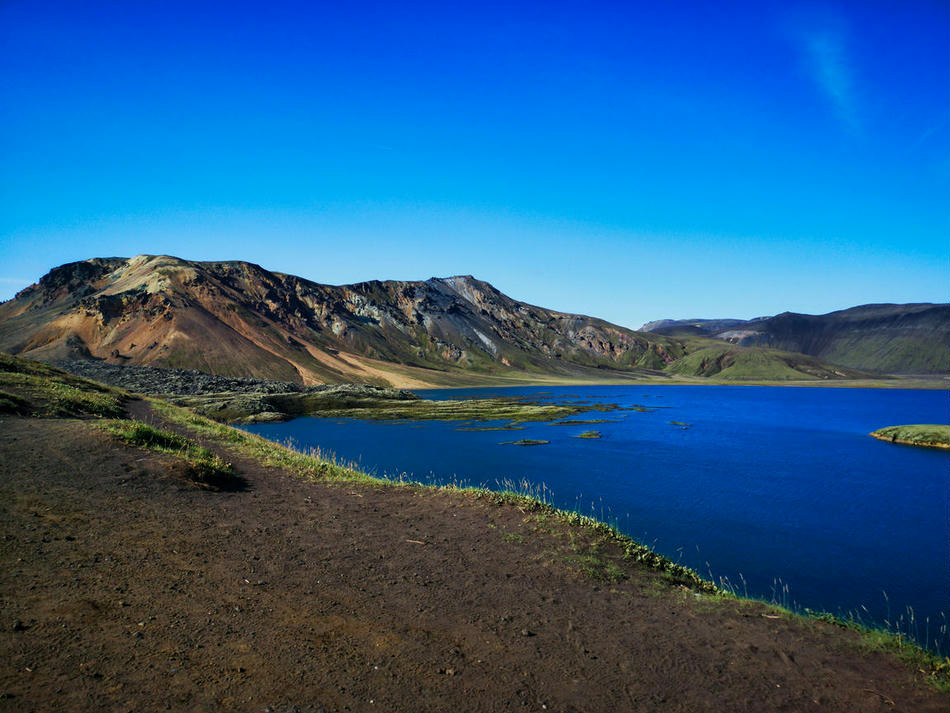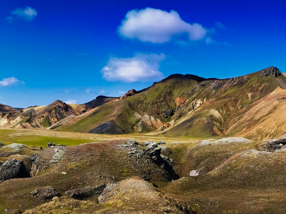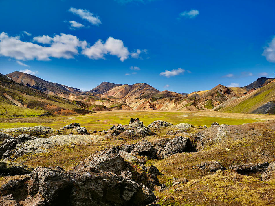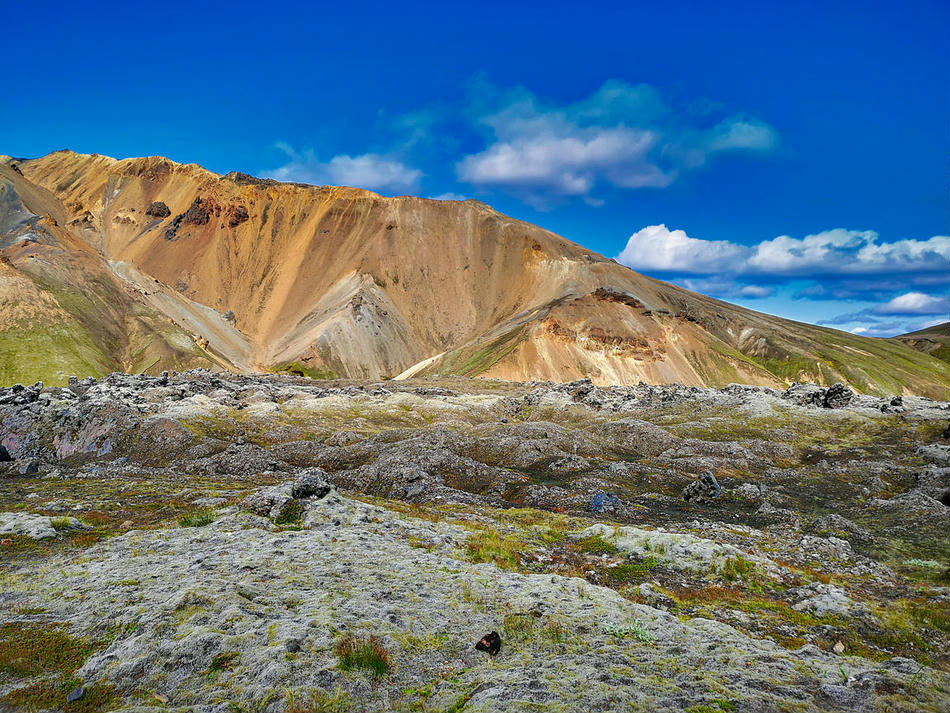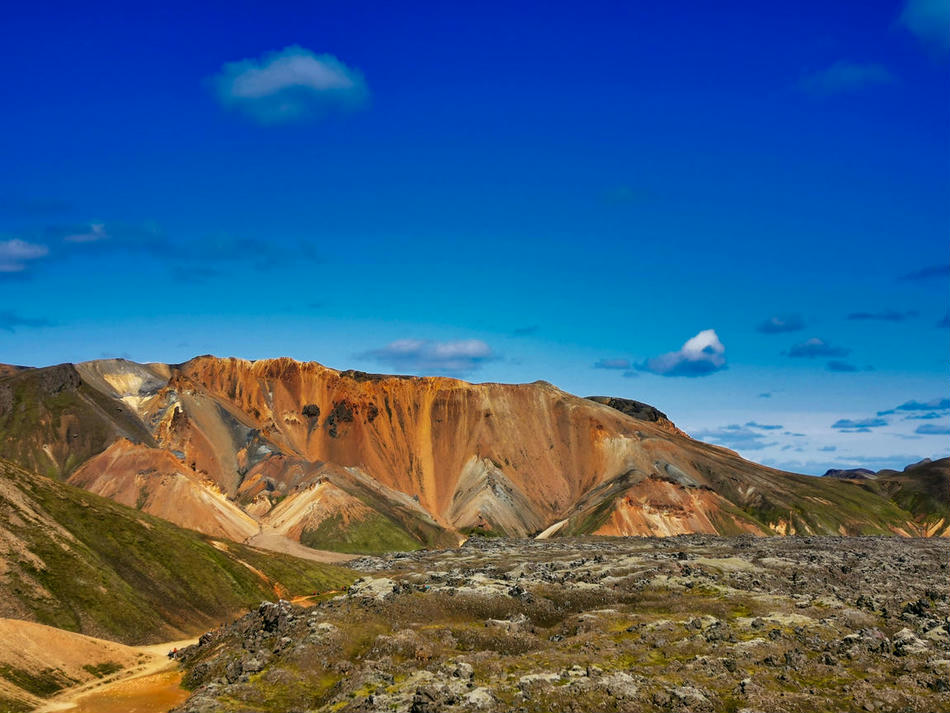 Aber wie auch beim ersten Wechsel von Fluss auf Lavafeld änderte sich hier der Schwierigkeitsgrad des Weges enorm: Wir mussten nicht mehr klettern, sondern konnten relativ entspannt dem breiten Laugarvegur (so heißt der Weg offenbar) folgen. Der Weg verlief fast konstant bergab (wir waren ja auch lange sehr anstrengend über das Lavagebiet hier hochgeklettert) und hinter jeder Kurve hatte man eine andere faszinierende Aussicht auf umliegende Bergketten. Die Sicht auf diese Bergketten ist wirklich grandios und für uns das eigentliche Highlight einer jeden Wanderung in Landmannalaugar. Die Bergketten sind richtig bunt. Die Hänge der Berge sind in so vielen verschiedenen Farben, die alle natürlichen Ursprungs sind. Mineralien aus vulkanischem Ursprung (Schwefel, Pechstein, Kalk, Eisen) und Moos machen die Berge zu einem richtig tollen Farbenspiel.
