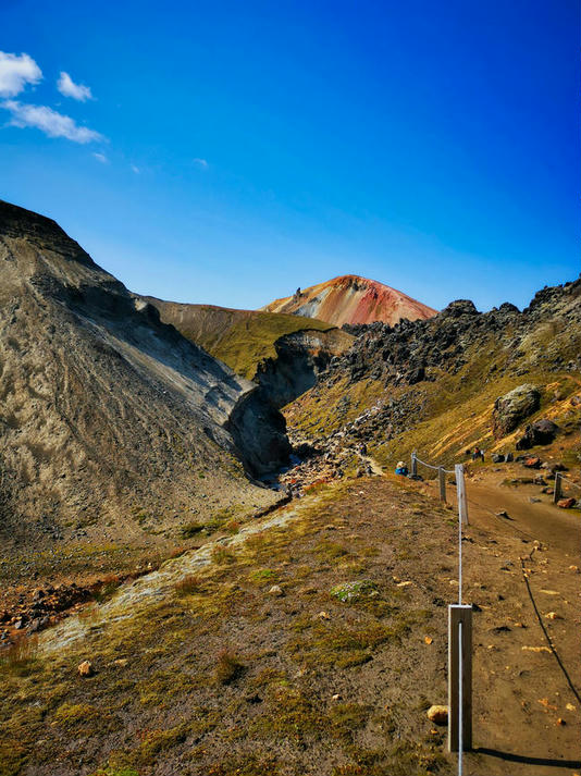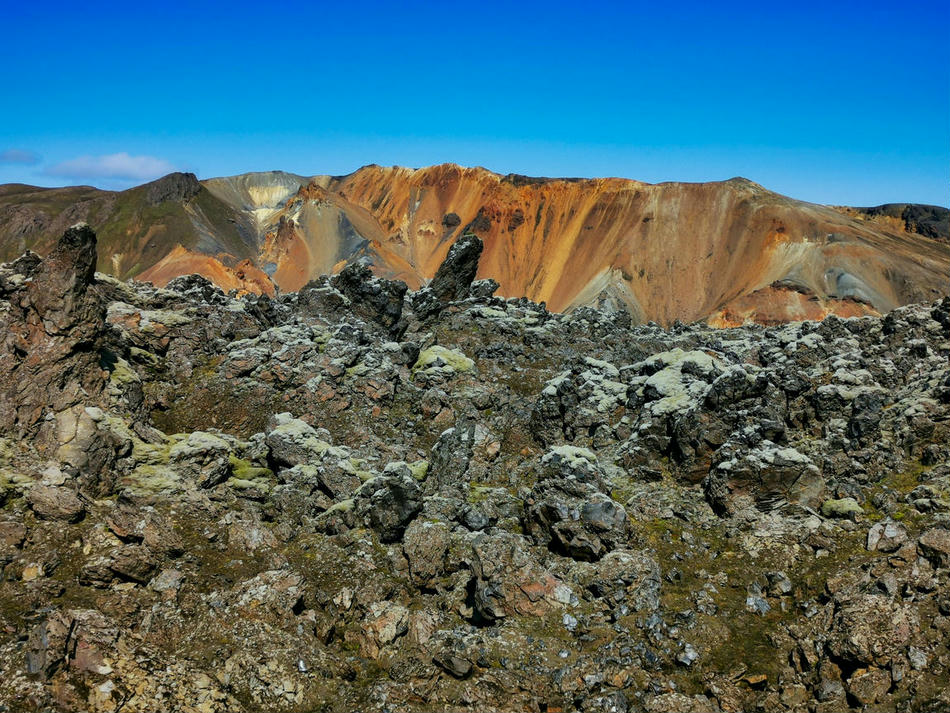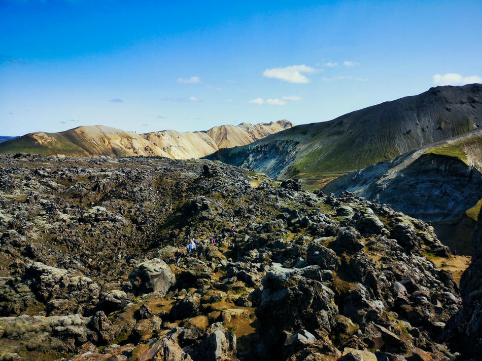 Nachdem wir den Flusslauf verlassen hatten, liefen wir mitten in das Laugahraun Lavafeld hinein. Gleichzeitig mit der Umgebung veränderte sich auch der Anstregungsgrad des Weges. Gerade noch sind wir entspannt über einen (zum Teil vielleicht schon etwas schmalen) Weg am Fluss entlang gelaufen und schon kletterten wir über Lavasteine. Der erste Teil des Weges war hier vielleicht auch noch okay, aber irgendwann mussten wir die Holzpfähle, die uns den Weg weisten, schon wie in einem Suchbild suchen. Überall gab es hier den schwarzen Stein und eine grandiose Aussicht auf bunte Berge.