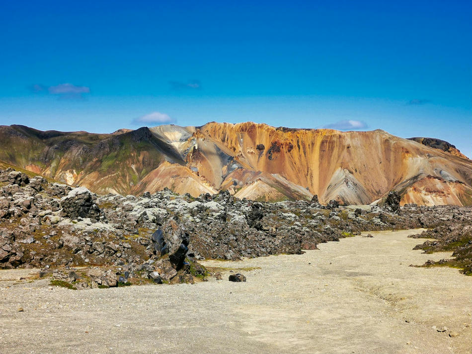 In unserer Naivität haben wir gedacht, wir könnten ja wohl den Weg über den Bláhnjúkur laufen. Von diesem Weg haben wir auch im Voraus schon gelesen, dass er die schönsten Aussichten auf das Gebiet bietet. Nach den ersten 300 m haben wir den Aufstieg auf den Berg Bláhnjúkur gesehen, der in keinster Weise so aussah, als könnten wir den schaffen. Kurzerhand haben wir also umdisponiert und sind 100 m zurückgelaufen, um den laut Plan einfacheren Weg durch das Lavafeld Laugahraun anzutreten. An dieser Stelle war dann unsere Motivation so bei 20 % angekommen. Paul war dafür verantwotlich vorher zu recherchieren, welche Wege hier für uns machbar sind, dann sind wir eine gefühlte Ewigkeit über die beschissensten Straßen gefahren, die wir je fahren mussten, haben extra eine Unterkunft (die Afternoon Cottages, siehe unten) mitten im Nirgends gebucht, um im Landmannalaugar wandern gehen zu können und jetzt ist der Weg, den wir laufen wollten zu schwer. Schöne Scheiße.